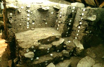 After he had finished his talk, we were led down into the dig in groups of 7 or 8. There we could see that the earth had been troweled into geometric cuts, with hundreds of numbered tags indicating age and location (as the site was first laid out in a grid. Each find was tagged with layer and location. This information was entered into their computer which could generate 3D charts and pictures of all the items and their locations. |