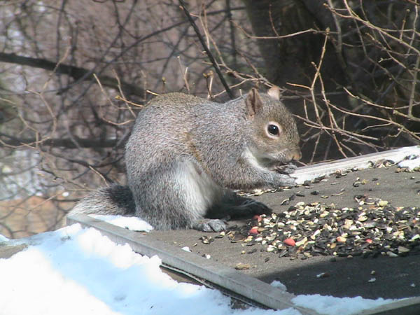 New CameraWe are planning a trip to Turkey in 2006 to see the total eclipse of the sun. And I said, "I'll have to have a digital video camera by then!" Then I said, "we'll get it before our April (2005) trip to Louisiana. " And then I said, "but I want to get comfortable before we leave for Lafayette, I'll just get it now!' It's a digital video camera, a Canon Elura 60. It has a 14x zoom, and can take both still pix and video - simultaneously! It will take a long time to learn all the features and even longer to become comfortable with it. I am approaching it slowly, so far only digesting what I need to know for the still picture festures. A squirrel? Of course a squirrel. I captured what was at hand.