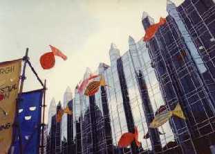 While overhead, reflected in the many faceted mirrored building, fish glided as in a giant goldfish bowl, and another year, acrobats angled in the wind. |