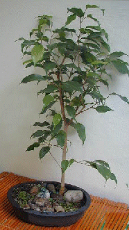 ![]() My own favorite is ficus. I have a large ficus tree, which is trimmed each spring when set outside. The clipped branches are thrust into a quiet corner of the garden where they will either root or die. In the fall, I dig out the rooted "bonsai" ficus and bring them inside to be planted in shallow pots. They take well to pruning; in fact they must be pruned often because their natural desire is to grow back into large ficus trees. I keep my bonsai ficus in a shallow bowl with an arrangement of rocks and ground cover. |