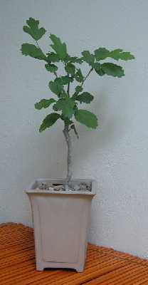 ![]() A new experiment is this bonsai Rose of Sharon. The plantlet was found under the branches of a larger Rose of Sharon. I have kept it pruned severly. It's shape is pleasing, and I wonder if it will ever flower! The Rose of Sharon drops its leaves in the fall, and at that time I move the plant to the garage where it can go dormant, without freezing. |