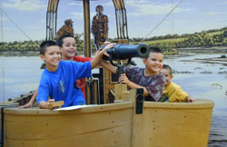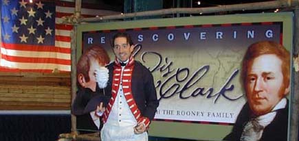 2 days before the event, the Elizabeth boat pulled out of the celebration, citing inexperience and worries that the boat might be damaged. We'd seen their inept departure from McKeesport and understood their concerns. But the organizers of the event had a problem. What to do? It turns out there is another replica keelboat, belonging to the "Friends of Discovery" in Onawa, Iowa. A flurry of calls, emails, strings pulled, travel arrangements made and licenses granted, and the second keelboat was trucked to Pittsburgh, a distance of 900 miles, on a holiday weekend. It arrived in time to be launched under the Liberty Bridge at 11 am on the 31st and lead the grand flotilla. On it was the Meriweather Lewis re-enactor who had been at the History Museum since July, and a Seaman re-enactor. (Meanwhile, the Elizabeth boat had been towed in the early morning hours and tied up at the point.) The shooting at Brunot's Island was re-enacted 3 times so that all the flotilla could drift by and see the action, and then the Iowa keelboat, heavy now with 2 Meriweather Lewis re-enactors, returned to the point. What a celebration! 2 keelboats, 3 Meriweather Lewis enactors and 1 Seaman. And zero Tippis, who chose to avoid the crowds and go to the Johnstown Folk Festival instead.