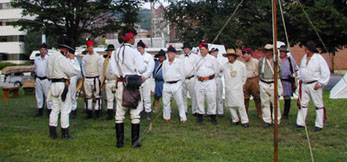 In late August, the keelboat was trucked to Elizabeth, where the corps of re-enactors gathered to begin their trek down the riverways. We went to Elizabeth to photograph the boat and the re-enactors, and were able to talk with many of them. They were so much more accessible in a small town like Elizabeth. We talked to one man from Rochester, PA and two from Ohio - it seems this crew will be drawn from many states, like the original. We returned the next day to Elizabeth, but the boat was gone! We were told it had gone to McKeesport for an afternoon celebration. Quick, into the car and arrived in McKeesport just in time to watch them push off. The wonderful pictures we captured on that afternoon appear on this site.