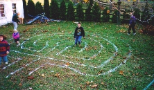 All the children were very curious! They watched while Nana made the pattern in the lawn. She told them she was making a path. "Only one way in" she said, "and then you take the same path right back out again." The children ran and ran. They had a wonderful time! Ryan had a watch with a second hand. He timed how long it took to run to the center. Julie was the winner! She ran the labyrinth in 55 seconds.