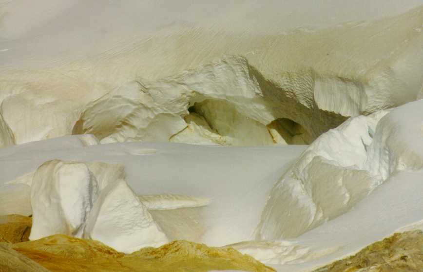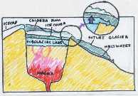 Vatnajokull is also unique in that it sits atop a live volcano. Steam and sulfurous gasses escape through vents at the top of the glacier. There is a lake, of melted glacial water, in the caldera of the volcano. It is covered over by hundreds of feet of glacier, and cannot be seen.
