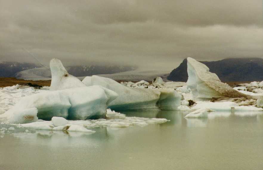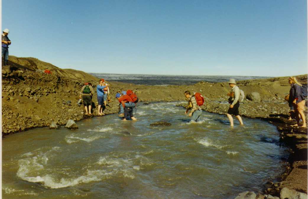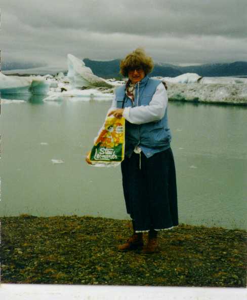 Vatnajokull, on the southeastern slopes of Iceland, is the largest glacier in Europe. Our tour took us around the glacier; we camped at its foot and walked close enough to touch it; we traveled to the high desert, and camped just behind its head. That was a stark and desolate campsite: sod "rugs" had been brought in to pitch our tents on, otherwise the ground would have been too uncomfortable for sleeping. There was a very small airstrip there, we strolled up to it and looked back, up to the peaks looming above us. Someone pointed to the snow cap, with steam rising from it. "Bet that's where we will hike tomorrow". The rest of us were incredulous, unbelieving. It seemed almost -- out of sight! But in the morning, after eating a hearty breakfast and tearing down the tents, Sigrun gathered us all together. "Are you ready for a little walk?" she asked. Several of us suggested we'd wait back here, and were told that was impossible, we'd be meeting the bus on the other side. And so we trekked up the mountain, Tippi bringing up the rear. Her boots were the products of Banana Republic; darling boots but not at all waterproof. Her feet were wet and cold, she was wet and cold and miserable. "Never again" she was heard to mutter. We hiked passed the steam vents, reminders that this glacier was sitting on top of a live volcano, to the top of the glacier where a hut had been built. It was a resting spot. The others had finished their rest when Tippi and Larry finally arrived. Again we brought up the rear. The rest of the tour group were always out of sight, but we had their tracks to follow. At the bottom of the snow field, luckily, some friends had waited to guide us to the bus.