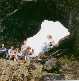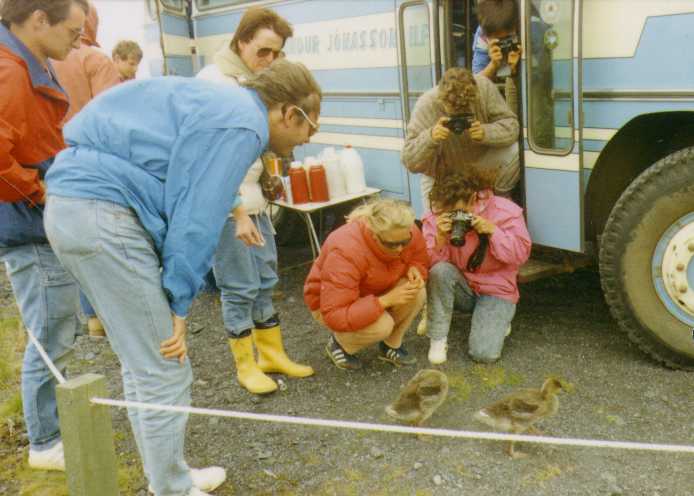 This is how the town records describe Eyvindur: "He has a happy disposition, athletic, an excellent swimmer and wrestler, fast on his feet beyond compare, especially on the steep slopes and so expert at hand-running that he is faster than the swiftest horse. He is tall and thin, with large hands and feet. He has blond curly hair and wears a moustache. He is agreeable in manner, well-groomed and clean, a skilled craftsman in wood and metal, able to read a little but cannot write at all."What is hand running? It is running, using the arms and knuckles as a second pair of legs, like a horse or dog would run. No one in Iceland can do it now, but in the days before roads and wagons, many young men could hand-run. Halla and Eyvindur were forced to leave their farm and become outlaws. Some people say that Eyvindur was caught stealing a rope and ran away to escape hanging. Others say that Halla killed a boy who was working for them. Halla wanted to burn their house down so that people would think they were dead but Eyvindur would not let her do it. They left their children behind. One daughter, named Olof, ran to the next farm, and so the children were saved from starving. Halla and Eyvindur first moved into the hills above the sheep farms. They built a hut near a hot spring, and stole sheep. They cooked the sheep in the boiling water of the spring. After a while the farmers noticed that some sheep were missing and went to capture the outlaws. Eyvindur escaped by hand-running but Halla was captured and taken to the settlement. The next winter Eyvindur had a very hard time. He caught wild birds and ate them raw. In the spring, Halla escaped from the town and joined Eyvindur and they moved to another area where again they built a hut of stones and sod, near to a spring. They lived there for 5 years, stealing sheep and other things from the farmers. Again, the farmers followed the sheep tracks and discovered Eyvindur and Halla's hut. Eyvindur and Halla had a narrow escape and just had time to bury their tools in a swampy place and run away to some lava caves. The farmers burned the hut and took back the sheep, but they did not catch the outlaws. The next winter, they were very hungry. Eyvindur was saying his prayers, but Halla said that would do no good. Then Eyvindur looked out the door, and there was a horse! They killed the horse and ate it, raw, all that winter. They used the skin as a door to their hut.